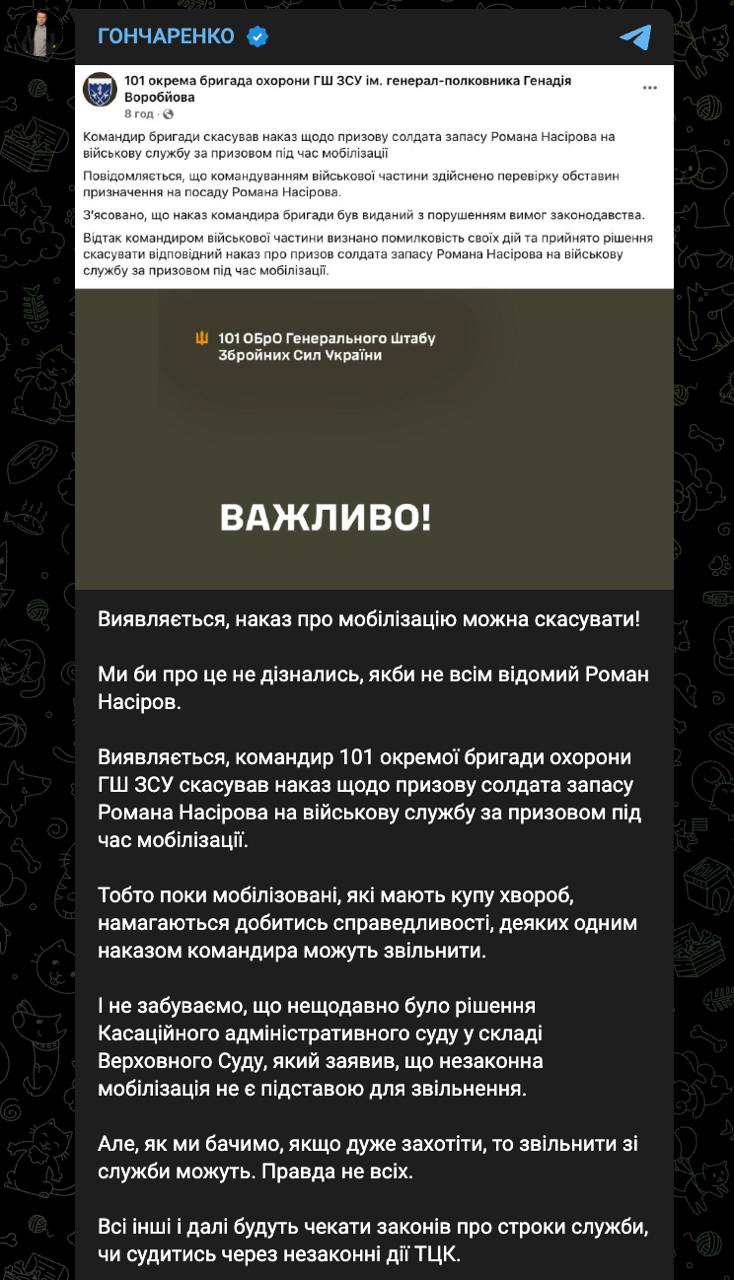 "То есть, пока мобилизованные, у которых куча болезней, пытаются добиться справедливости, некоторых одним приказом командира могут уволить. Как мы видим, если очень захотеть, то уволить со службы могут. Правда, не всех. Все остальные и дальше будут ждать законов о сроках службы или судиться из-за незаконных действий ТЦК", - пишет также нардеп Алексей Гончаренко.