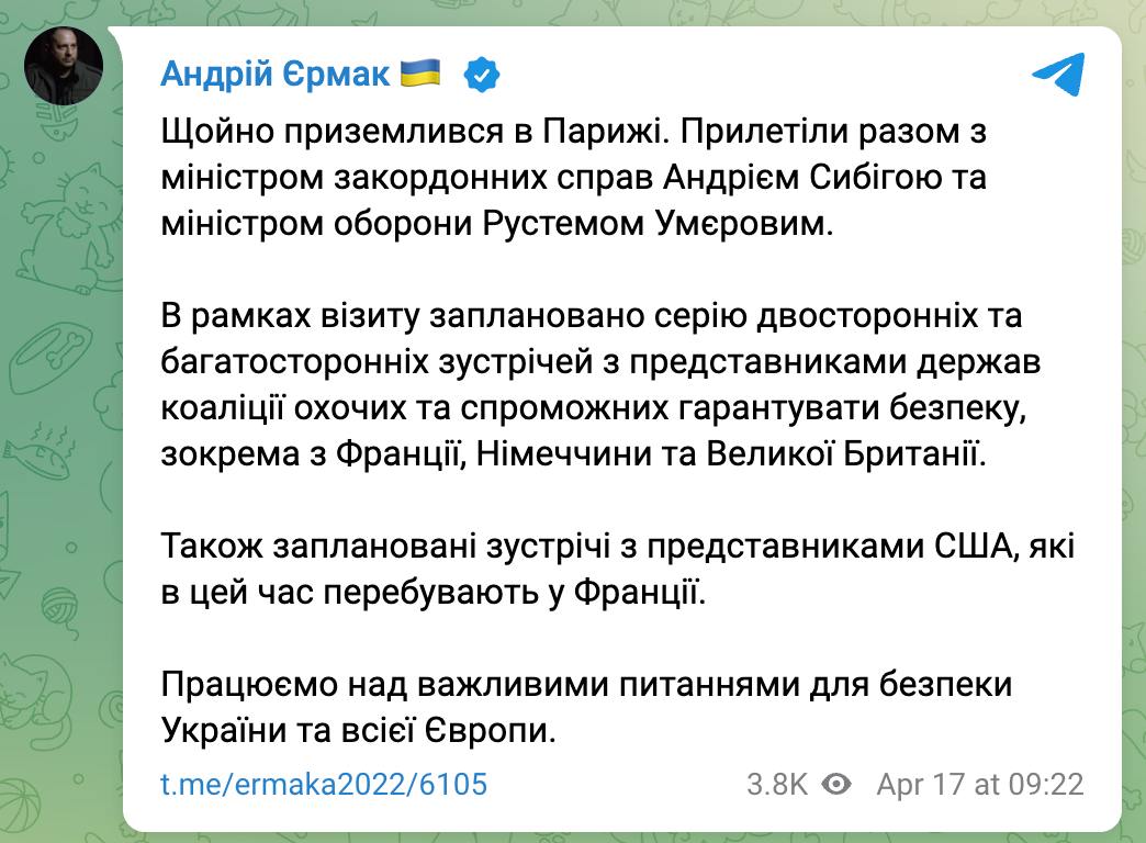 Руководитель Офиса президента Андрей Ермак, министр иностранных дел Андрей Сибига и министр обороны Рустем Умеров сегодня в Париже встретятся с представителями США и "коалиции желающих".
