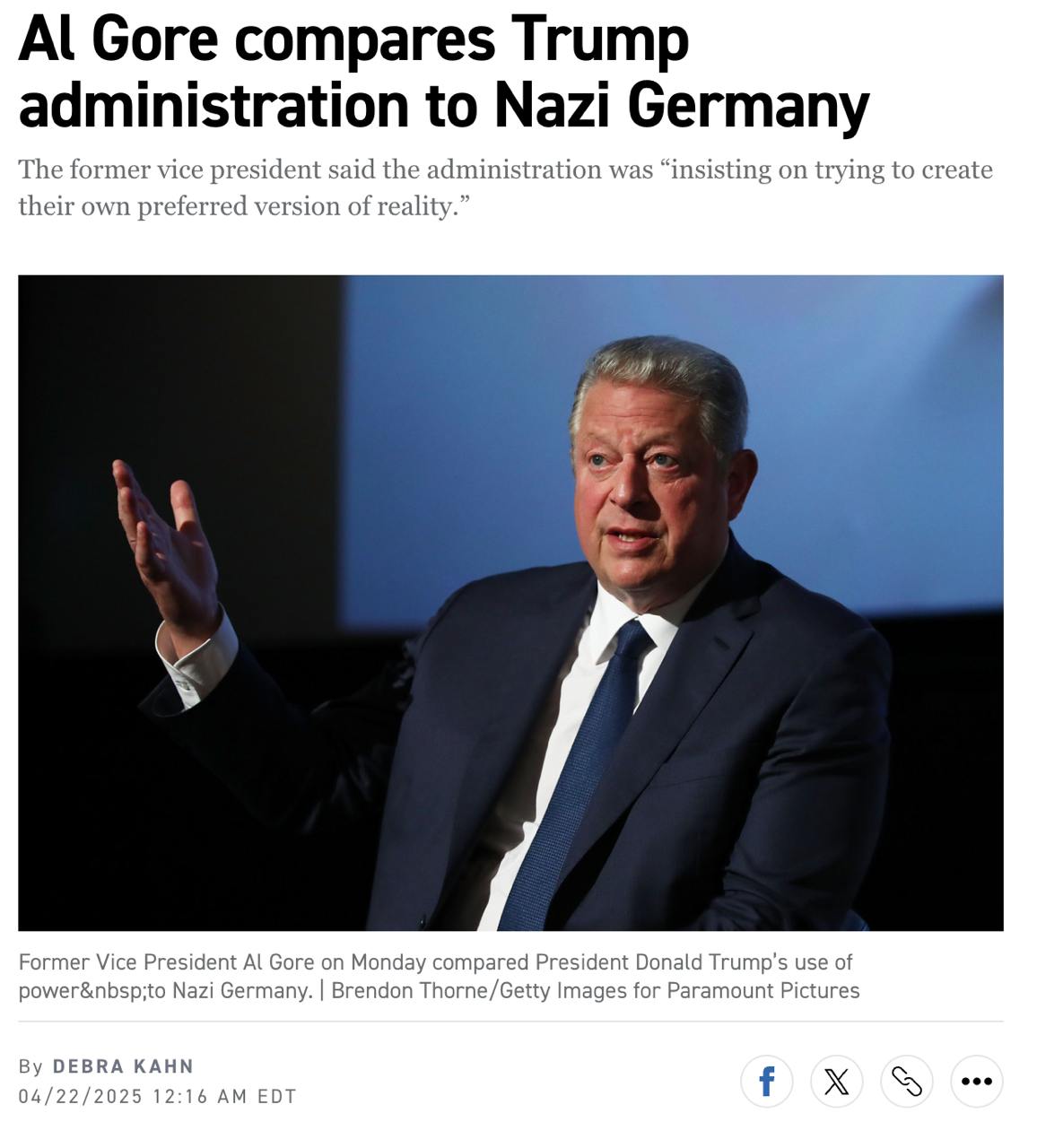 Выступая на мероприятии в рамках Недели климата в Сан-Франциско, Гор заявил, что администрация Трампа "пытается создать собственную предпочтительную версию реальности" для достижения своих масштабных целей, аналогичных целям нацистской партии Адольфа Гитлера в 1930-х и 1940-х годах.