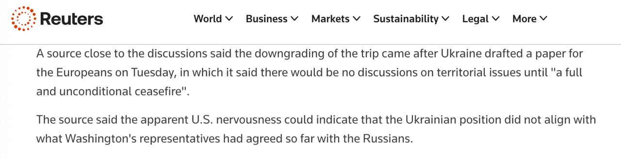 Тем временем Reuters со ссылкой на источник, близкий к переговорам, пишет, что встреча министров в Лондоне сорвалась после того, как во вторник "Украина подготовила документ для европейцев, в котором заявила, что не будет никаких обсуждений территориальных вопросов до полного и безоговорочного прекращения огня".
