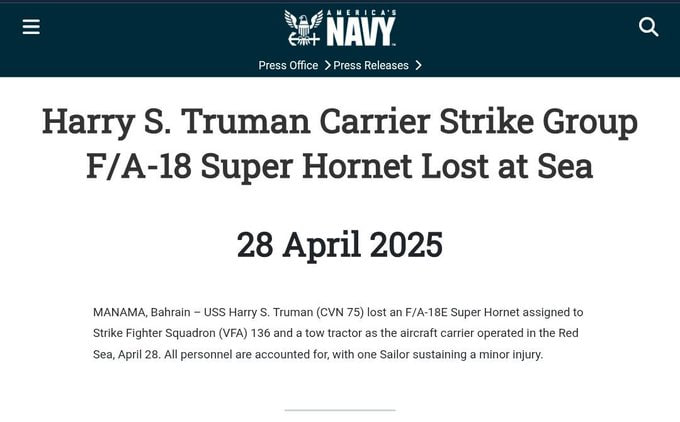 Согласно отчету, 28 апреля по местному времени истребитель F/A-18E "Super Hornet" и его палубный тягач на американском авианосце "Гарри Трумэн" в Красном море "случайно упали в море".