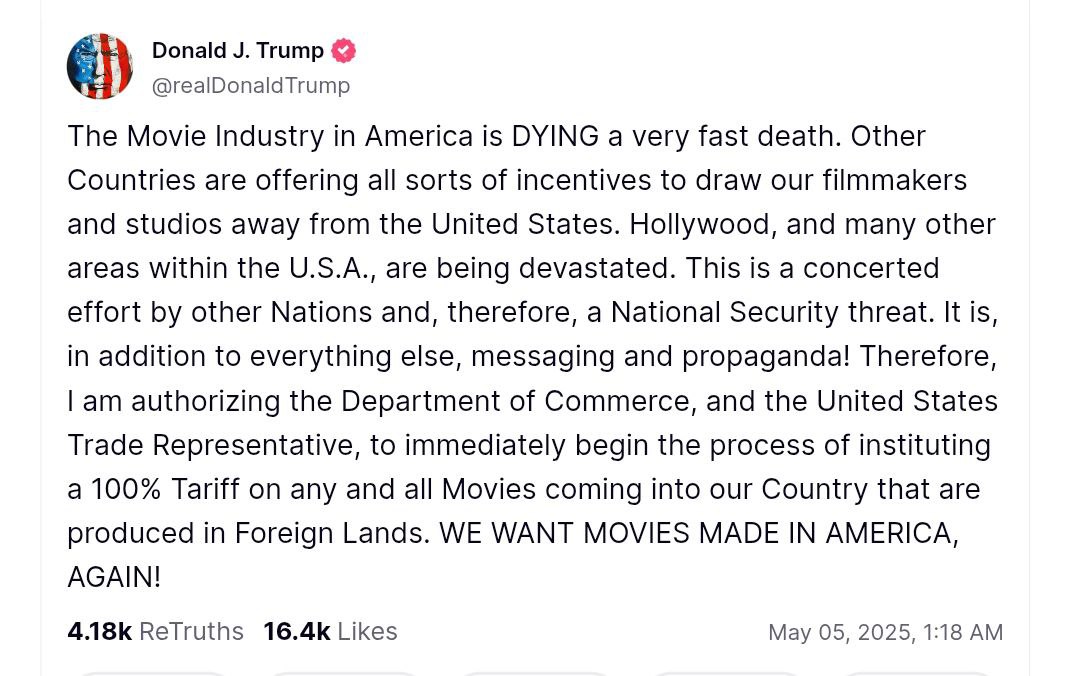 "Киноиндустрия в Америке умирает очень быстрой смертью. Другие страны предлагают всевозможные стимулы, чтобы увести наших режиссеров и студии из Соединенных Штатов. Голливуд и многие другие районы в США опустошаются. Это согласованные усилия других стран и, следовательно, угроза национальной безопасности. Это, в дополнение ко всему прочему, месседжи и пропаганда! Поэтому я уполномочиваю Министерство торговли и торгового представителя Соединенных Штатов немедленно начать процесс введения 100%-ной пошлины на все фильмы, поступающие в нашу страну", - написал Трамп в своей соцсети.