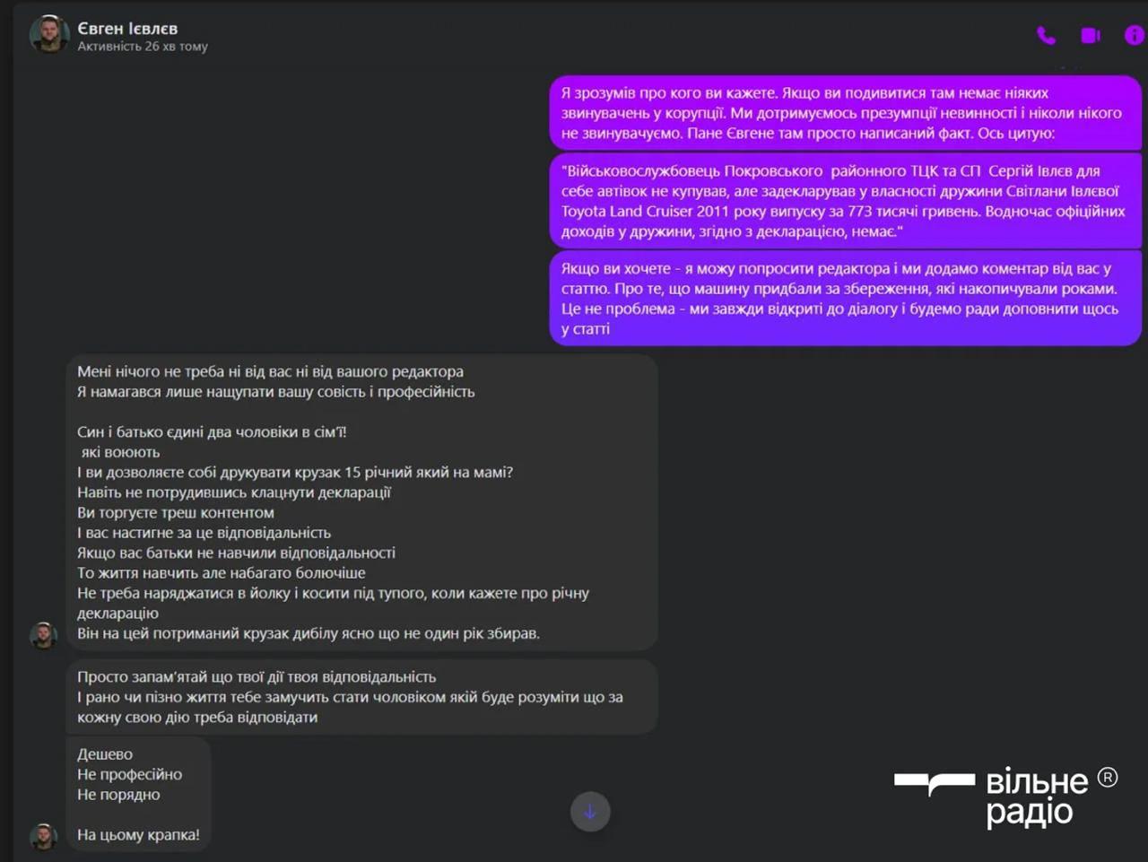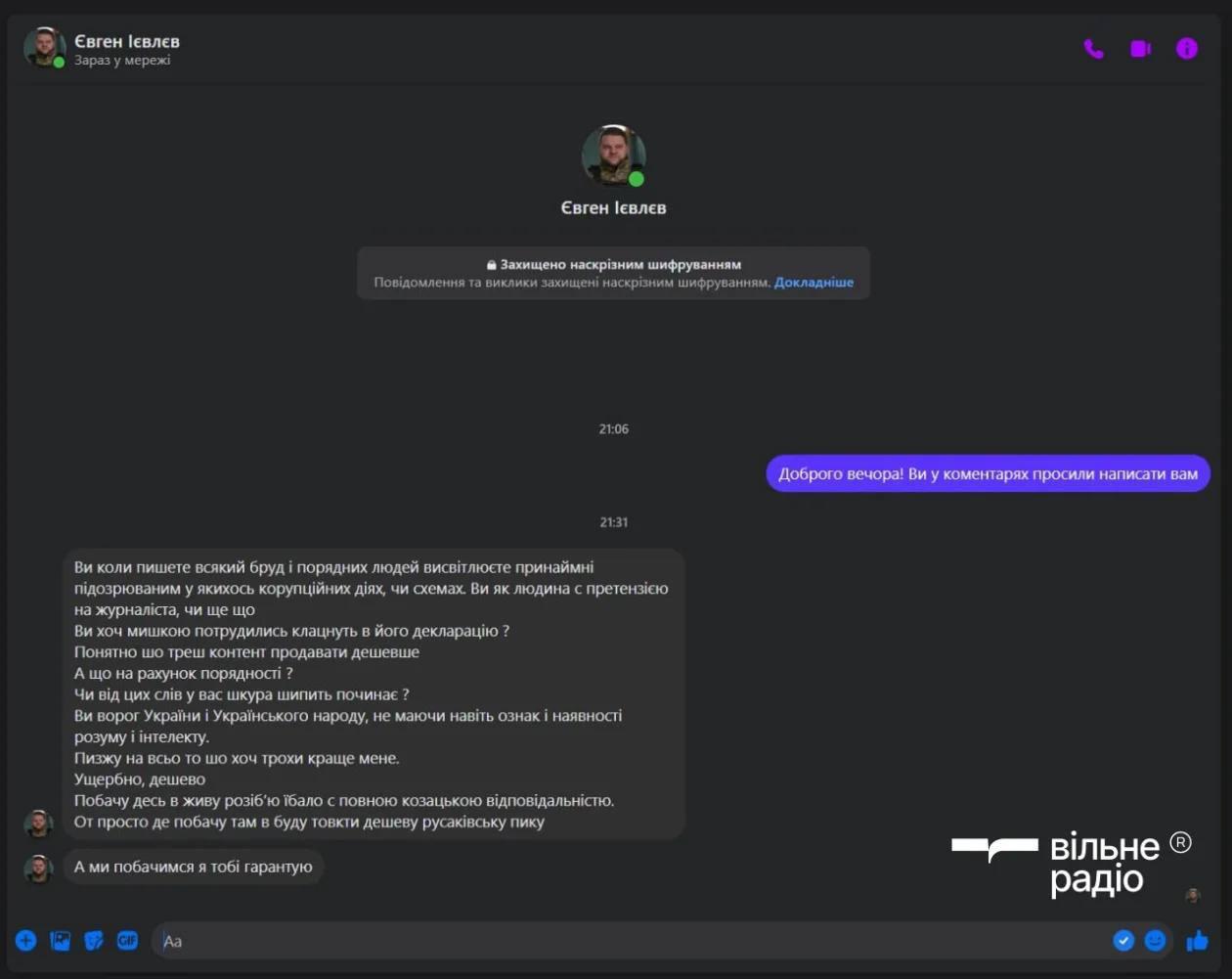 А позже журналист Евгений Вакуленко опубликовал переписку с сыном фигуранта материала, спикером Киевской городской военной администрации Евгением Иевлевым. Тот обвиняет журналиста в непрофессионализме, говорит, что он не изучил в полной мере декларацию, а напоследок угрожает насилием.