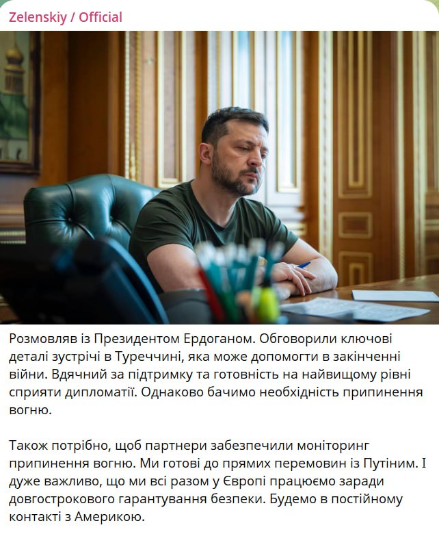 "Обсудили ключевые детали встречи в Турции, которая может помочь в окончании войны... Одинаково видим необходимость прекращения огня. Также необходимо, чтобы партнеры обеспечили мониторинг прекращения огня. Мы готовы к прямым переговорам с Путиным. И очень важно, что мы все вместе в Европе работаем ради долгосрочного обеспечения безопасности. Будем в постоянном контакте с Америкой", – написал Зеленский в своем телеграм-канале.