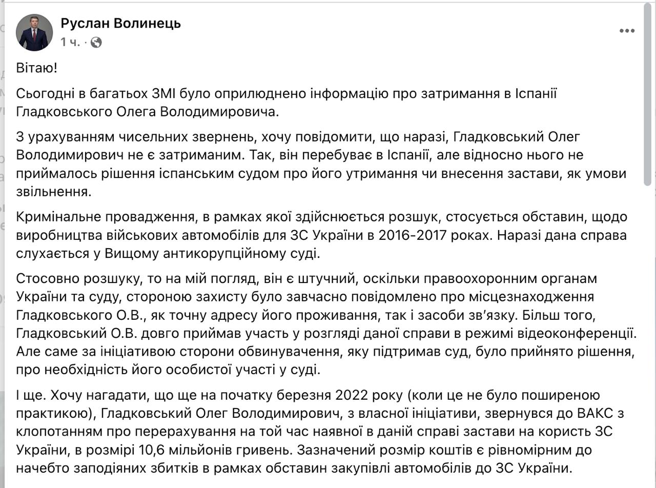 "Гладковский Олег Владимирович не задержан. Да, он находится в Испании, но в отношении него не принималось решение испанским судом о его содержании или внесении залога как условия освобождения", - пишет Руслан Волынец.