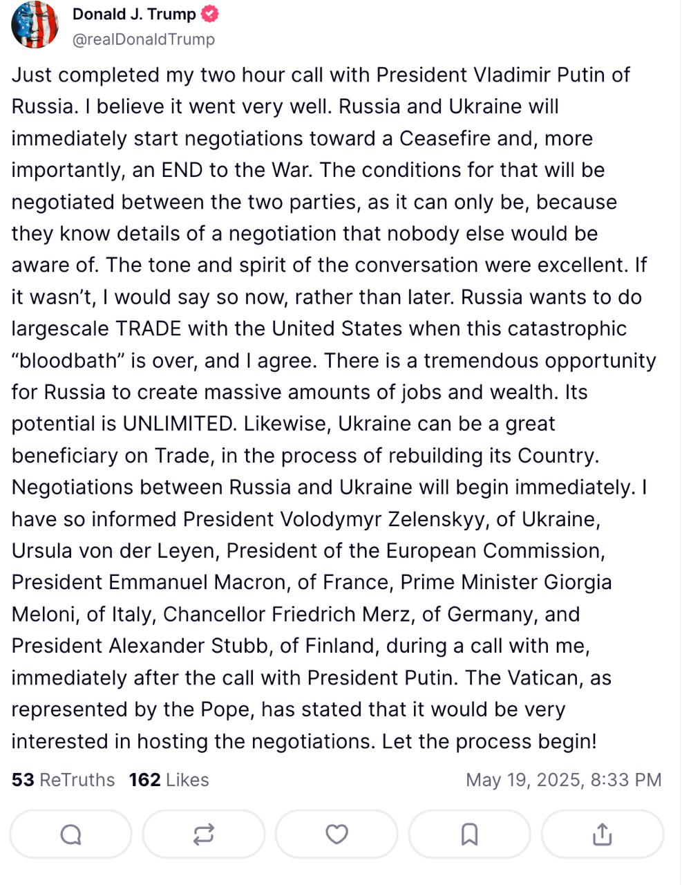 Президент США Дональд Трамп прокомментировал свой телефонный разговор с президентом РФ Владимиром Путиным, который состоялся вечером 19 мая. Он заявил, что "считает, что он прошел очень хорошо", а "Россия и Украина немедленно начнут переговоры о прекращении огня и, что ещё важнее, о полном окончании войны".