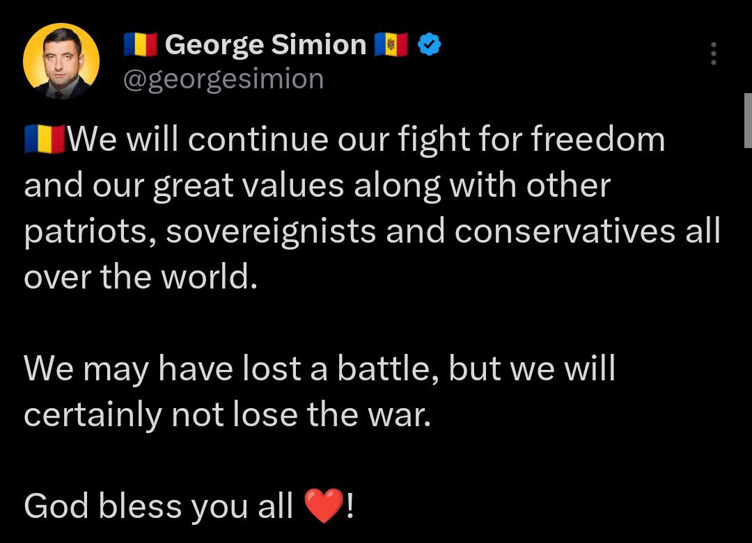 Симион обещает продолжить борьбу "в союзе с консерваторами всего мира".