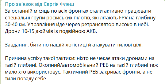 По его словам, за последний месяц Россия сформировала специальные группы пилотов, которые управляют дронами на больших расстояниях с помощью ретрансляторов, размещённых высоко в небе.
