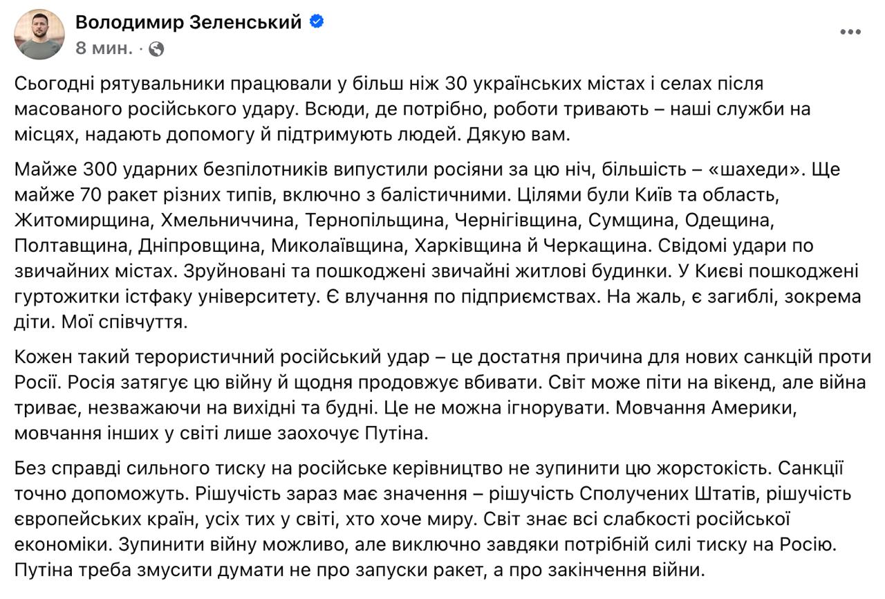 "Каждый такой террористический российский удар – достаточная причина для новых санкций против России. Россия затягивает эту войну и ежедневно продолжает убивать. Мир может пойти на уик-энд, но война продолжается, несмотря на выходные и будни. Это нельзя игнорировать. Молчание Америки, молчание других в мире только поощряет Путина", - заявил президент.