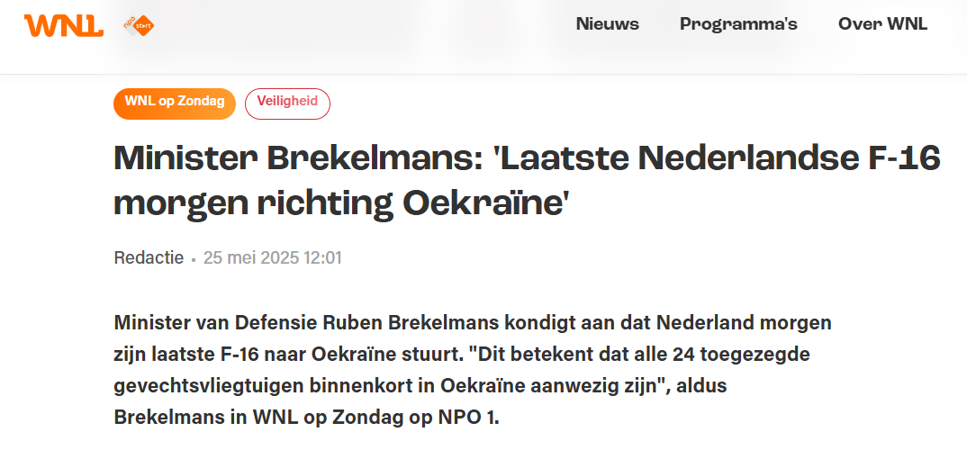 Завтра Нидерланды передадут Украине последний истребитель F-16 из 24, которые были обещаны ранее. Об этом заявил министр обороны Рубен Брекельманс во время интервью изданию WNL.