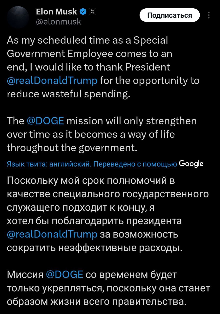 "Поскольку мой срок полномочий в качестве специального государственного служащего подходит к концу, я хотел бы поблагодарить президента США Дональда Трампа за предоставленную мне возможность сократить расточительные расходы. Миссия DOGE со временем будет только укрепляться, поскольку она станет образом жизни во всех органах государственной власти", - написал Маск.