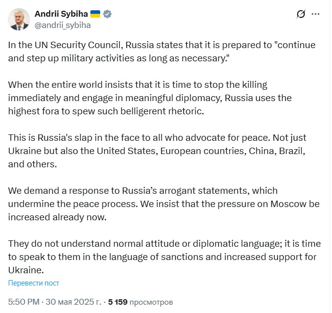 "В Совете Безопасности ООН Россия заявляет, что готова "продолжать и наращивать военные действия столько времени, сколько потребуется". Когда весь мир настаивает на том, что пора немедленно прекратить убийства и заняться осмысленной дипломатией, Россия использует самые высокие форумы, чтобы изрыгать такую воинственную риторику. Это пощечина России всем, кто выступает за мир. Не только Украине, но и США, европейским странам, Китаю, Бразилии и другим. Мы требуем ответа на высокомерные заявления России, которые подрывают мирный процесс. Мы настаиваем на том, чтобы давление на Москву было усилено уже сейчас", – написал Сибига.