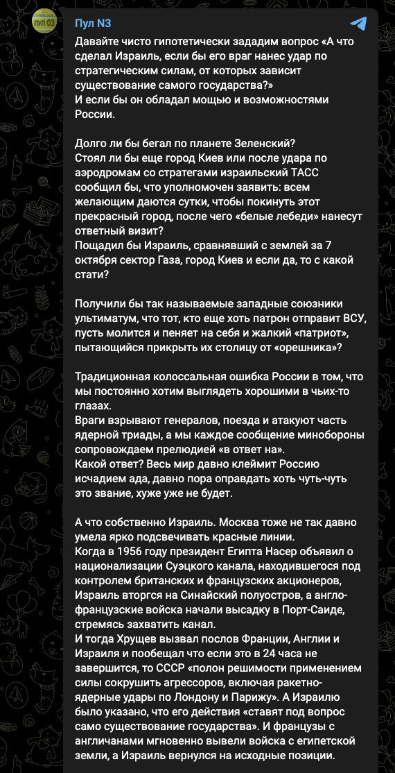 Так, журналист кремлевского пула (админ телеграмм-канала "Пул 3") Дмитрий Смирнов в своей публикации задаётся вопросом "а что бы сделал Израиль, если бы его враг нанёс удар по стратегическим силам, от которых зависит существование самого государства?"