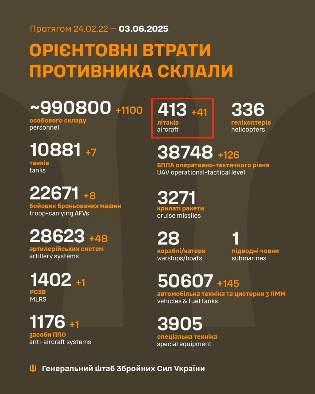 "После обработки дополнительной информации из различных источников и ее верификации, что потребовало определенного времени, сообщаем, что общие потери РФ составили 41 военный самолет, среди которых стратегические бомбардировщики и другие виды боевых воздушных судов", - говорится в сообщении.