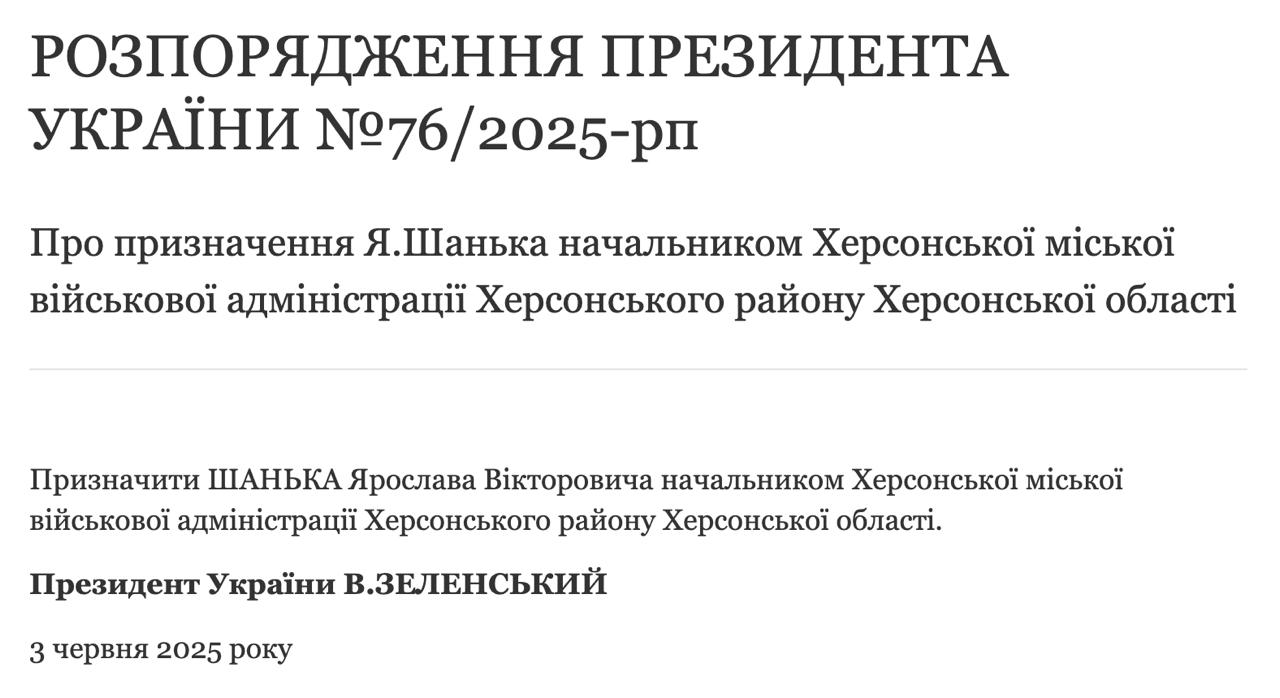 "Назначить Шанько Ярослава Викторовича главой Херсонской городской военной администрации Херсонского района Херсонской области", - говорится в документе.