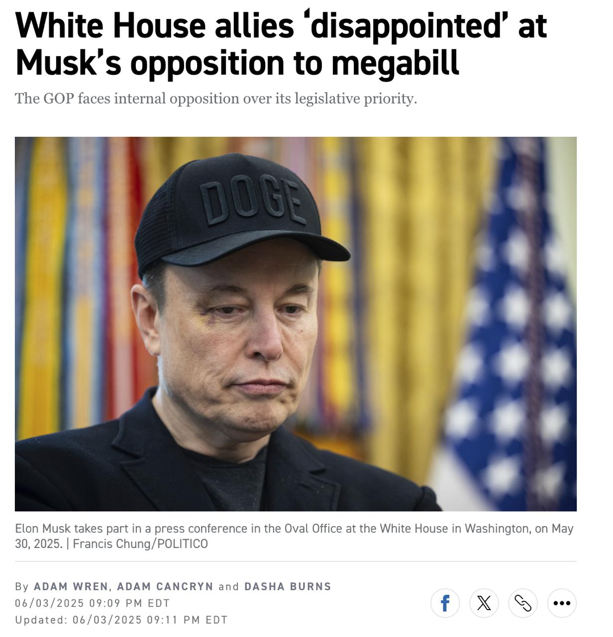 Чиновники считают его атаку "попыткой возмездия" после того, как Маск не смог убедить республиканцев сохранить налоговую льготу на электромобили в крупном законопроекте, которая принесла бы пользу Tesla.