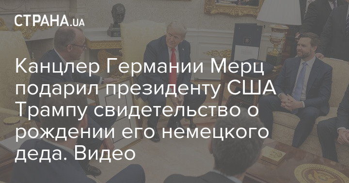 Канцлер Германии Фридрих Мерц в ходе своего визита в Вашингтон передал президенту США Дональду Трампу свидетельство о рождении его деда Фридриха Трампа. Документ оформлен в золоченую рамку.