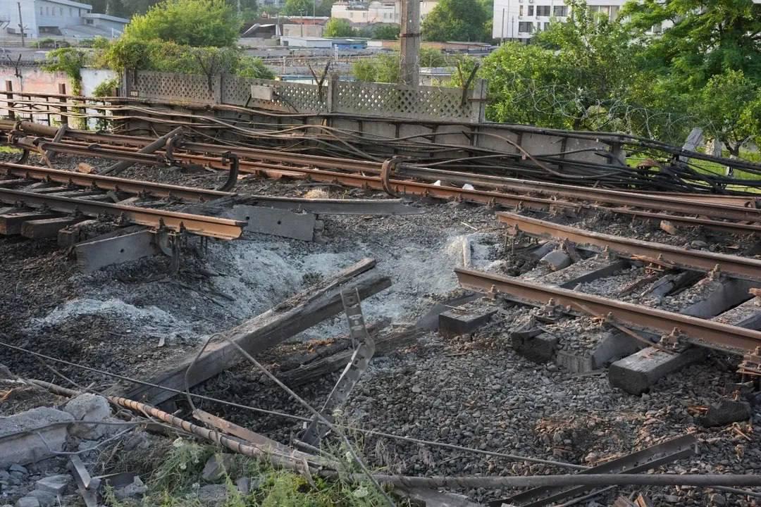 08:37 Фото разрушенного здания и поврежденных ж\д путей в Киеве.