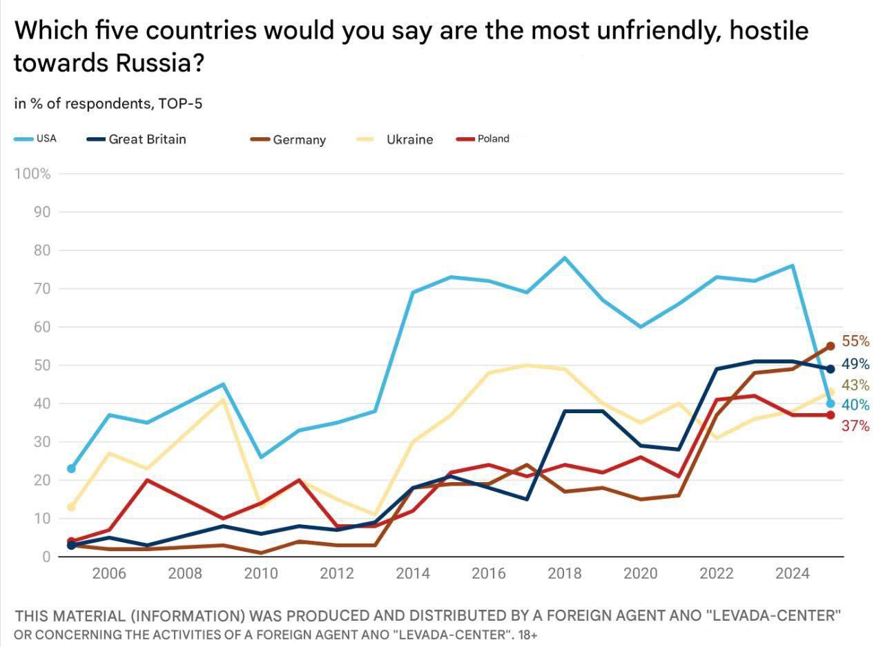 Так, если в 2022 году США считали врагом около 75% опрошенных, то к 2025 году этот показатель снизился до 40%.