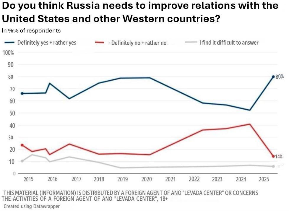 Одновременно среди населения РФ выросла поддержка идеи улучшения отношений с западными странами, включая США. В 2024 году за нормализацию выступали 52% респондентов, а в 2025-м этот показатель достиг 80%, став самым высоким за весь период наблюдений с 2015 года.