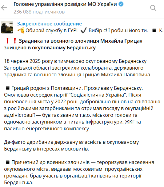 В захваченном Россией городе Бердянск Запорожской области убит назначенный российскими властями "исполняющий обязанности мэра" Михаил Грицай.