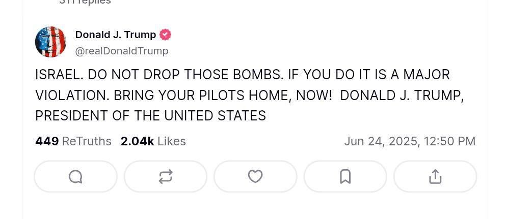 "Израиль, не сбрасывайте эти бомбы. Если вы это сделаете, это будет серьезным нарушением. Верните своих пилотов домой, немедленно!" - написал американский глава.