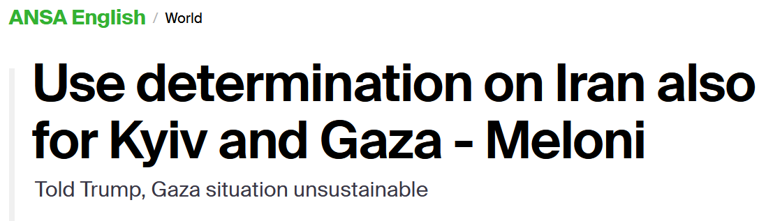 "Я сказала президенту Дональду Трампу и сказала на саммите, что такая же решимость, проявленная в отношении войны между Израилем и Ираном, должна быть проявлена и по двум другим соглашениям о прекращении огня – для Украины и для Газы", – заявила Мелони после саммита НАТО в Гааге.