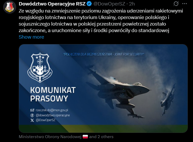 08:35 Ночью Польша поднимала истребители и приводила ПВО в состояние боевой готовности из-за массированной атаки РФ по Украине, сообщили в Оперативном командовании ВС Польши.