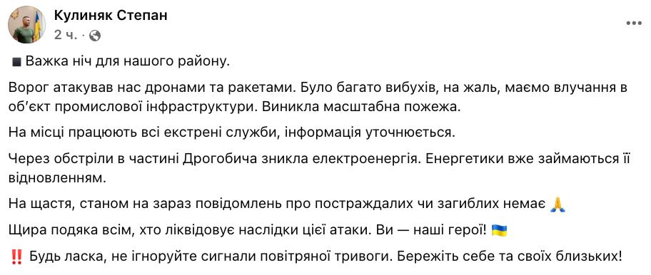 09:23 Прилет во Львовской области был в Дрогобычском районе, заявил его глава Степан Кулиняк.