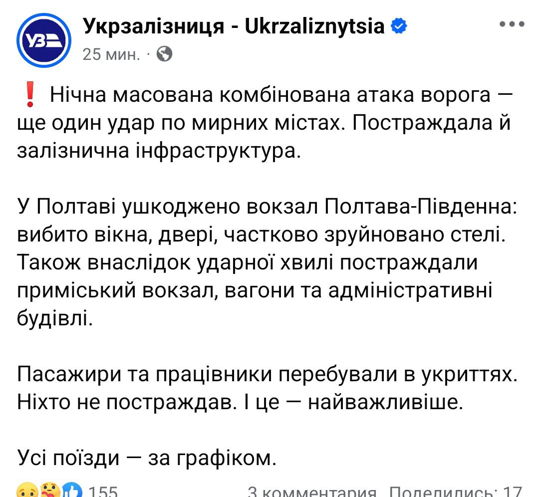 10:41 В результате ночной массированной атаки пострадала железнодорожная инфраструктура в Полтаве, сообщает "Укрзализныця".