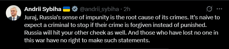 "Юрай, чувство безнаказанности России является основной причиной ее преступлений. Наивно ожидать, что преступник прекратит свои действия, если его преступление прощают, а не наказывают. Россия ударит и по другой щеке. А те, кто не потерял никого в этой войне, не имеют права делать такие заявления", - написал Сибига.