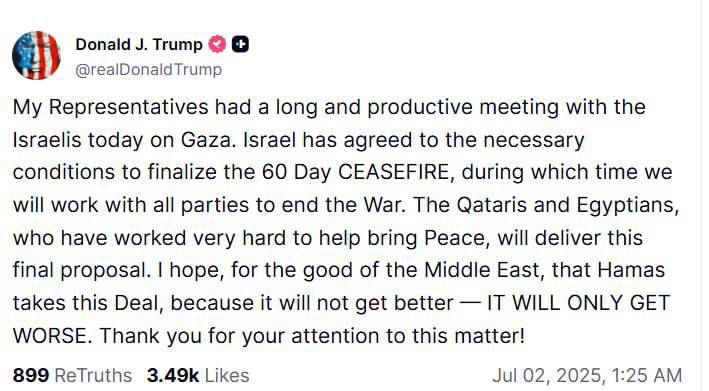 Об этом сообщил президент США Дональд Трамп в своей социальной сети Truth Social.