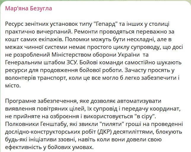 Ресурс зенитных установок типа немецкой "Гепард" и других в Киеве практически исчерпан. Ремонты производятся преимущественно за счет самих экипажей.