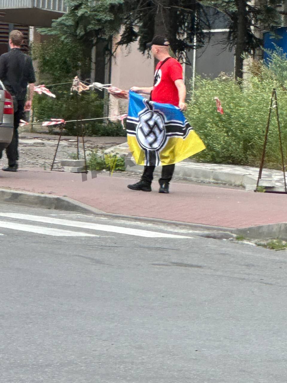 Мужчину, который вышел с флагом Украины со свастикой на улицу, ищут.