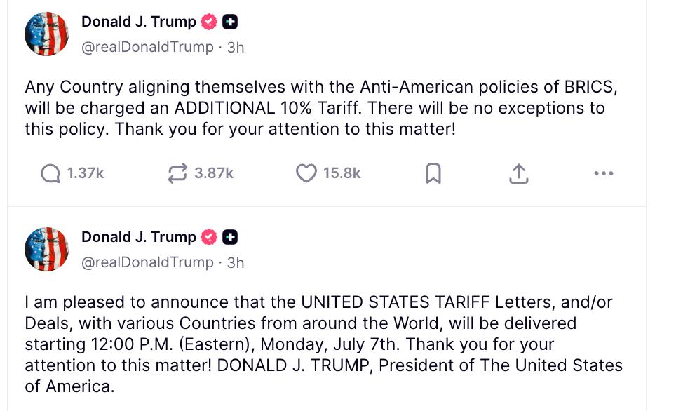 Он предупредил, что любая страна, которая будет поддерживать политику БРИКС, столкнется с дополнительным тарифом в размере 10%.