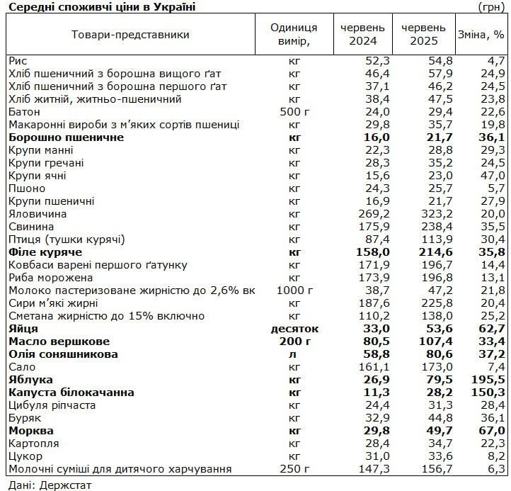 Об этом сообщает пресс-центр Государственной службы статистики Украины в своем сравнительном отчете цен июня 2024-го и июня 2025 года.