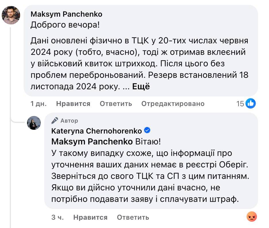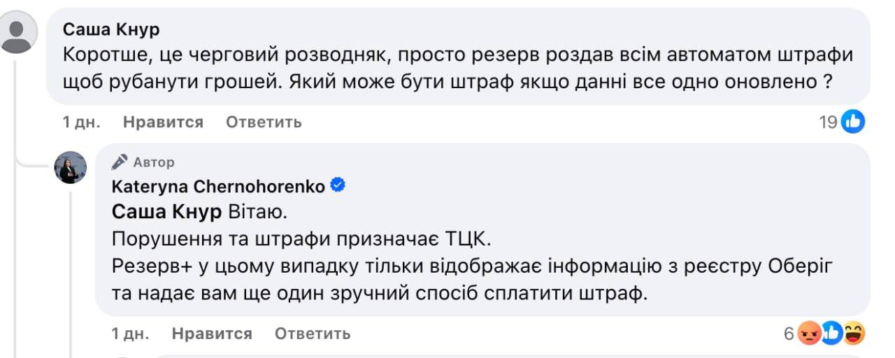 Екатерина Черногоренко, замминистра обороны, на вопросы пользователей об этих штрафах отвечает, что "похоже, что информации об уточнении ваших данных нет в реестре "Оберег". Обратитесь в ТЦК с этим вопросом. Если вы действительно уточнили данные вовремя, не нужно подавать заявление (о признании человеком нарушения. - Ред.) и платить штраф", - пишет Черногоренко.