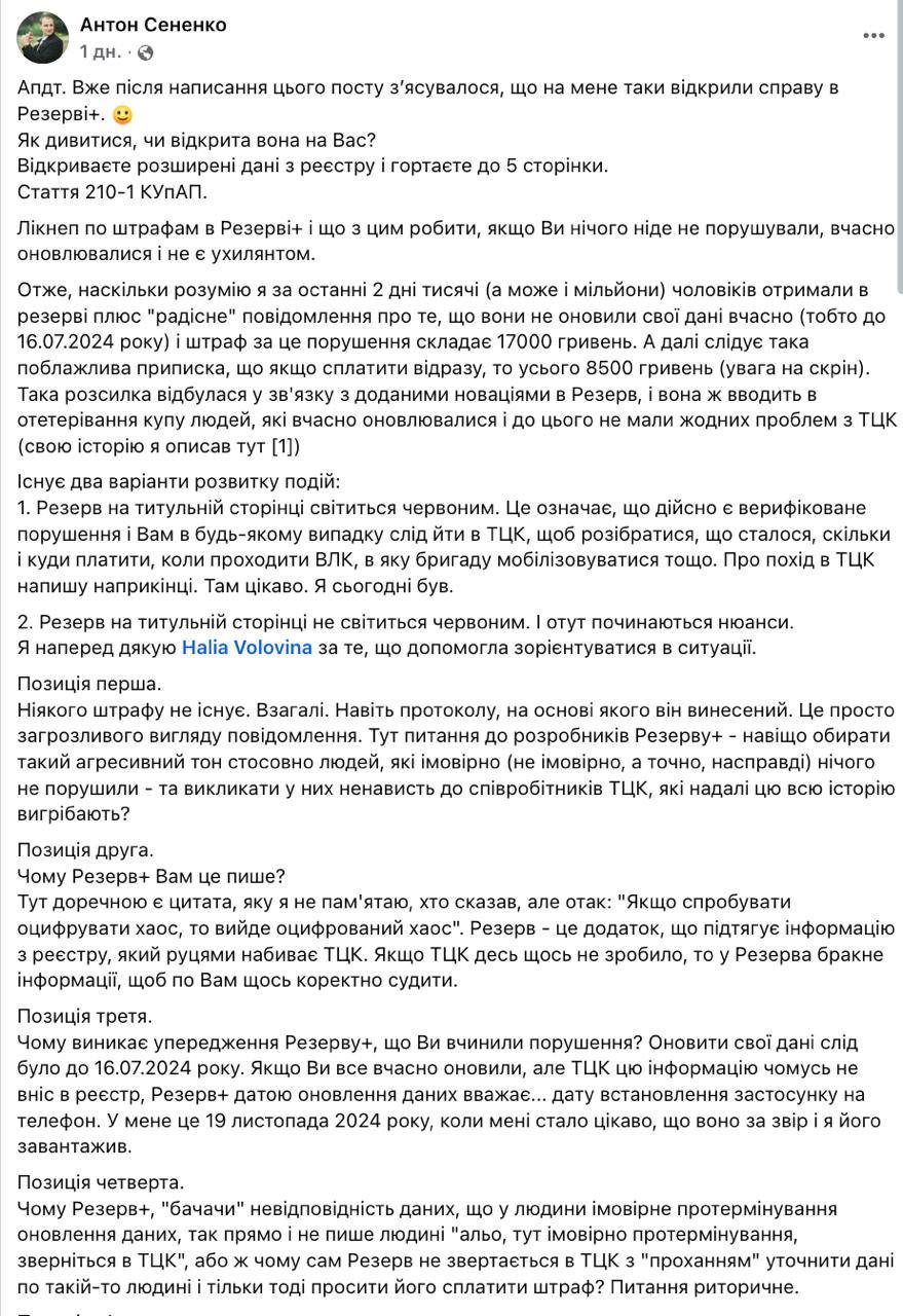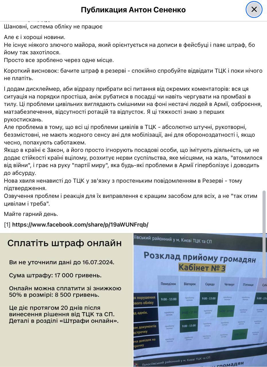 "Часы приема - это величина сугубо приблизительная, а дни приема могут быть отменены просто потому что. Прямо сейчас, в этот момент в ТЦК приехали сотни мужчин с таким же статусом, как у меня. Просто уточнить, что штрафа нет. Проверить. Убедитесь. Я только что там был и это лютая жесть. Там коллапс", - пишет он.
