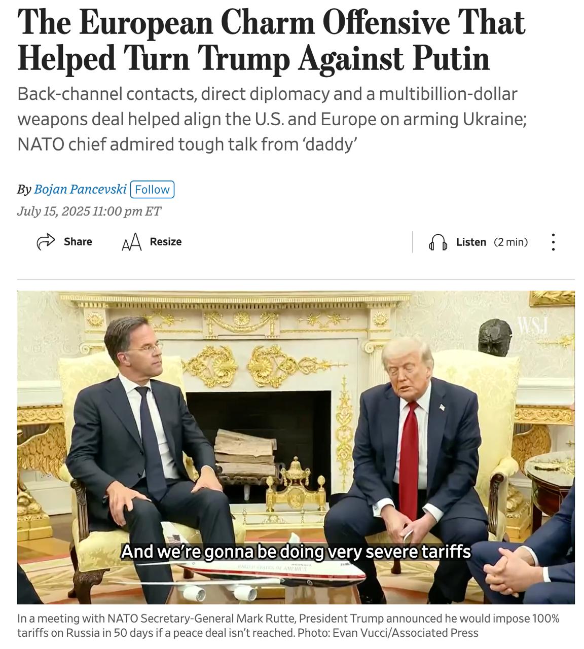 Президент США набрал канцлера ФРГ Фридриха Мерца поздно вечером 11 июля после просмотра кадров российских авиаударов по украинским городам, чтобы выразить недовольство Владимиром Путиным. Мерц понял, что терпение Трампа закончилось, и он готов принять его предложение - использовать немецкие средства для закупки американского оружия для Украины.