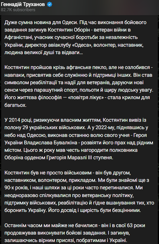 13:39 Во время выполнения боевого задания погиб украинский лётчик, директор авиаклуба "Одесса" Константин Оборин. Об этом сообщил мэр Одессы Геннадий Труханов.