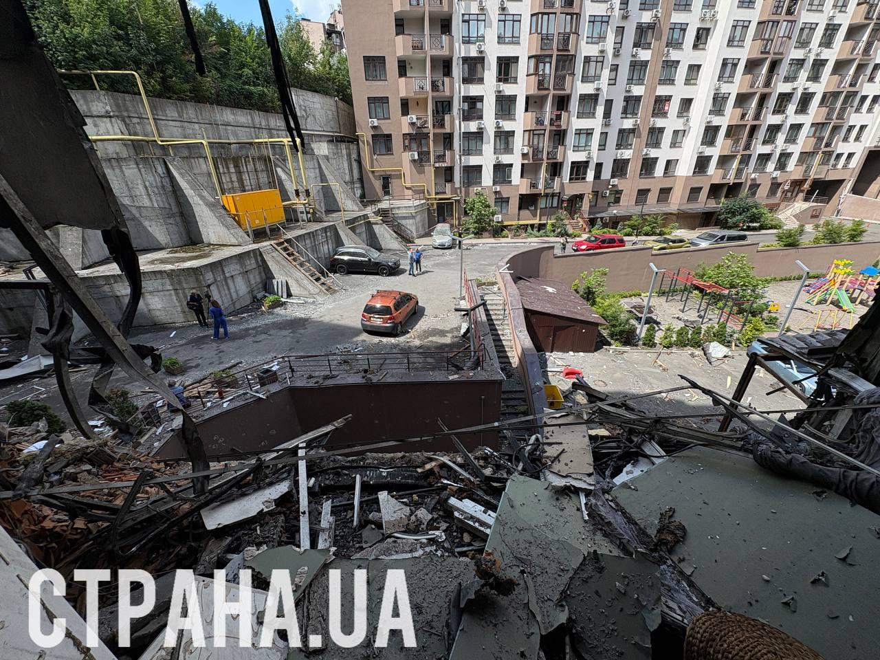 По словам местных жителей, в этот раз упали обломки. Полностью выгорели два этажа, где находились коммерческие помещения и жилые квартиры. Повреждены ещё три этажа и автомобили во дворе.