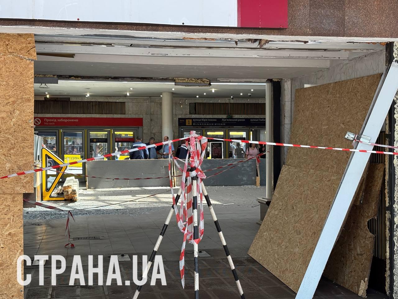 09:28 Еще видео повреждений у входа в метро Лукьяновка в Киеве.