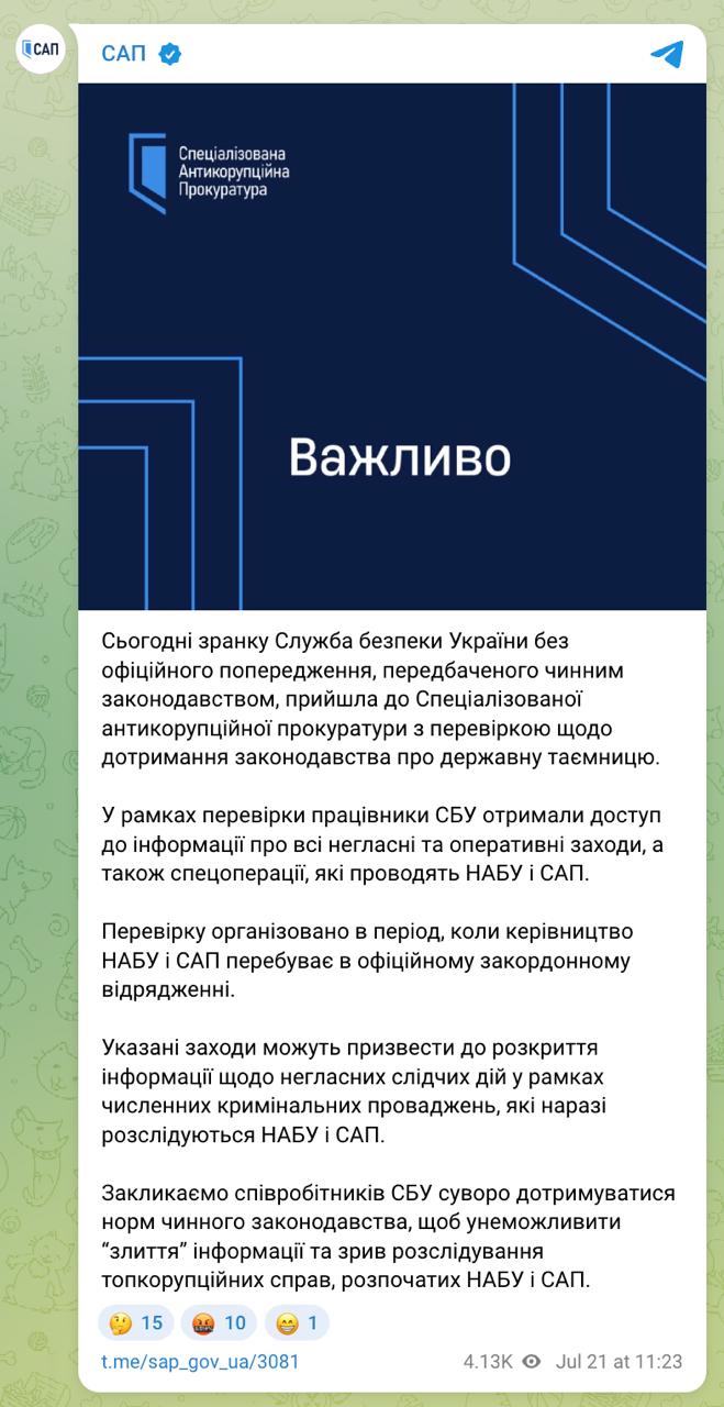 "В рамках проверки сотрудники СБУ получили доступ к информации обо всех негласных и оперативных мероприятиях, а также спецоперациях, которые проводят НАБУ и САП", - сообщает специализированная прокуратура, давая понять, что это может делаться для того, чтобы организовать утечку информации фигурантам уголовных дел: "эти действия могут привести к раскрытию информации о негласных следственных действиях в рамках уголовных дел, которые расследуют НАБУ и САП".