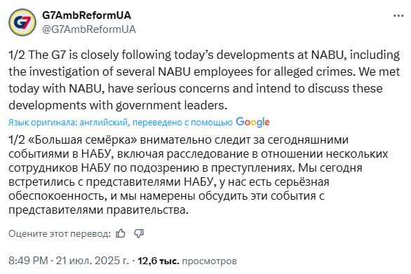 ""Большая семёрка" внимательно следит за сегодняшними событиями в НАБУ, включая расследование в отношении нескольких сотрудников НАБУ по подозрению в преступлениях. Мы сегодня встретились с представителями НАБУ, у нас есть серьёзная обеспокоенность и мы намерены обсудить эти события с представителями правительства", – говорится в сообщении.