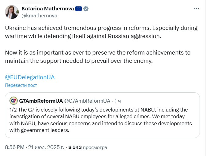 "Сейчас как никогда важно сохранить достижения реформ, чтобы сохранить поддержку", – написала Матернова, комментируя заявление послов G7.