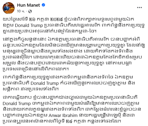 "После разговора с исполняющим обязанности премьер-министра Таиланда Его превосходительством Пхумтамом Вечачаем, уважаемый президент Дональд Трамп сообщил мне позитивную новость о том, что тайская сторона также согласилась на предложение достопочтенного президента о немедленном прекращении огня. Это позитивная новость для солдат и народа обеих стран", - написал Манет.