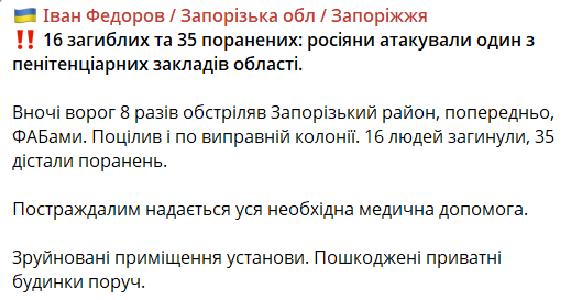 По его словам, ночью РФ нанесла по Запорожскому району восемь ударов, предположительно авиабомбами ФАБ. Один из них пришелся по пенитенциарному учреждению.