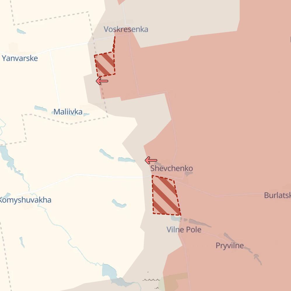 Российские войска продвинулись у границ Днепропетровской области. Продвижения зафиксированы в районе Воскресенки и Шевченко.