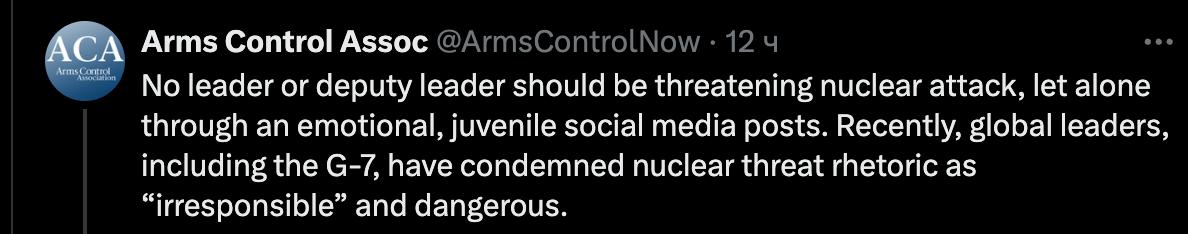 "Ни один лидер или его заместитель не должен угрожать ядерным ударом - тем более делать это с помощью эмоциональных, инфантильных публикаций в социальных сетях. В последнее время мировые лидеры, включая страны "Группы семи", осудили риторику ядерных угроз как "безответственную" и опасную", - заявили в организации, базирующейся в Вашингтоне.