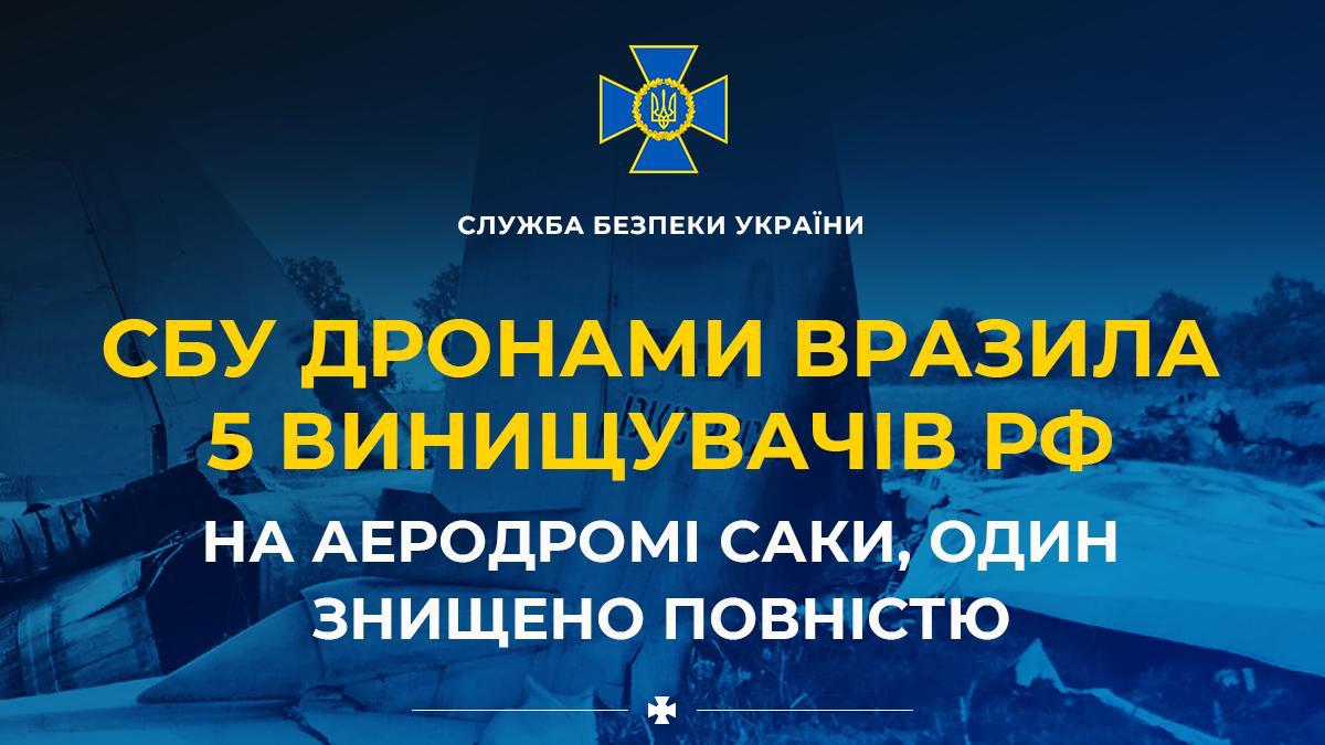 13:29 СБУ заявляет, что в результате спецоперации в Крыму поразила беспилотниками пять российских истребителей на аэродроме Саки.